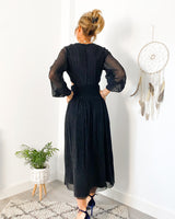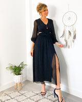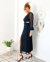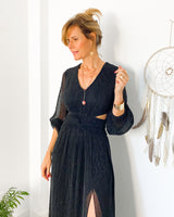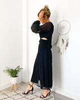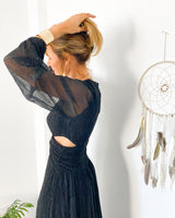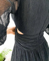 Vestido largo negro de tejido elástico arrugado. Manga larga semitransparente con cinturilla entallada fruncida. Cremallera en parte trasera.