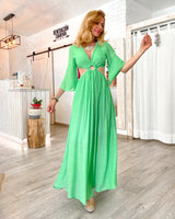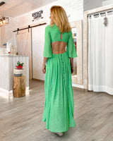 Vestido largo de manga larga con vuelo. Vestido doble con unión en la cintura, parte de la espalda al descubierto con cinturilla fruncida con cordón para ajustar. Espectacular!