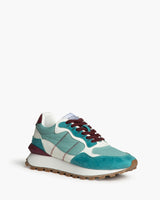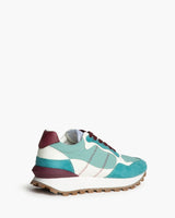 Zapatilla de deporte sport en tonos turquesa y morado. Suela de goma, y empeine de serraje y tela. Pequeña alza interior que eleva el pie.