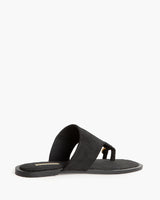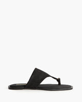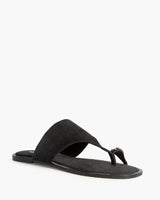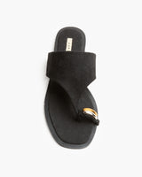 Sandalia negra de antelina tipo pala con aplique dorado y plateado en el dedo.
