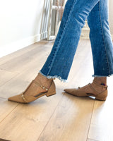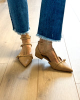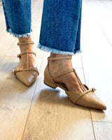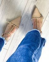 Zapato destalonado color nude. Hebilla fina delantera y hebilla ajustable en el talón. Muy cómodos y versátiles.