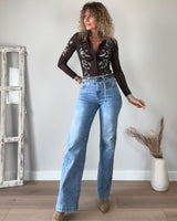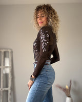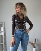 Body marrón chocolate decorado con pedrería plateada. Abotonado en la parte delantera. Tejido semitransparente.