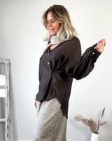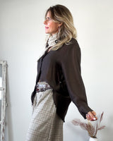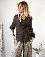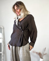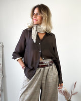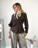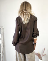 Camisa marrón con un ligero brillo. Muy fluida y vaporosa. Dos posiciones para abrochar. Muy bonita y estilosa.