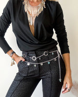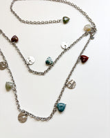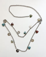 Cinturón de cadena plateada con complementos y charms de corazones verdes y charms circulares. Terminación del cinturón con decoración de pieza y cristal.