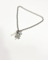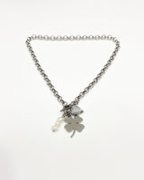 Collar de trébol, corazón azulado y perlas. Cadena combinada con bolas rosas. Acero.