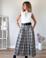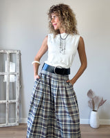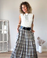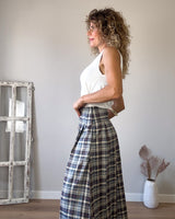 Falda de cuadros en tonos azul, terracota y beige. Cinturilla con cremallera y bolsillos laterales.