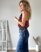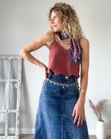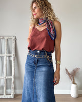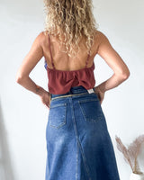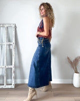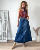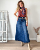 Falda vaquera denim larga con cortes y vuelo. Tejido elástico. Tiro alto.