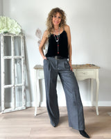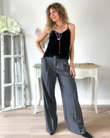 Pantalón gris jaspeado de corte amplio y pinzas delanteras. Bolsillos laterales y cinturilla. Corte amplio.