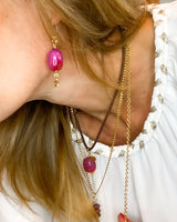 Pendiente largo de piedra de Agata fucsia con trébol dorado.