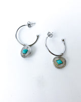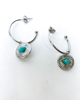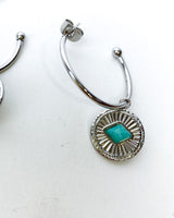 Pendiente de aro grande con charm decorado con pieza en acero y piedra color turquesa.