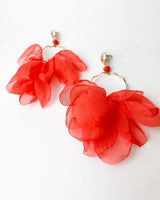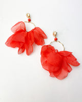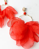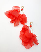 Pendientes color coral en forma de pétalos de flor y hojas en gasa. Preciosidad de pendientes.