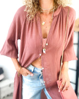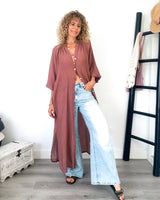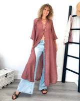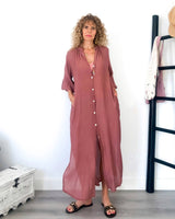 Vestido largo rosa palo de tipo bambula. Manga larga con goma y abotonado en la parte delantera. Muy estiloso y con espectacular caída.